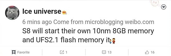 Samsung Galaxy S8 получит 8 ГБ ОЗУ и флэш-память UFS 2.1Согласно новым данным от инсайдеров из Поднебесной, готовящийся к анонсу флагман Samsung Galaxy S8 будет оснащен рекордными 8 ГБ оперативной памяти вместо 6 ГБ, о которых ходили слухи ранее.