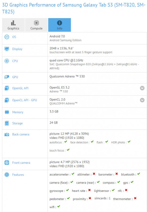 Samsung Galaxy Tab S3 c Snapdragon 820 SoC посетил GFXBenchСегодня в базе данных бенчмарка GFXBench был замечен не представленный еще официально планшет Samsung Galaxy Tab S3.