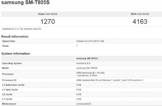 Samsung Galaxy Tab S получит 8-ядерный чипсет Exynos 5433В базе данных бенчмарка Geekbench засветился не анонсированный еще планшет южнокорейской Samsung с индексом SM-T805S, который является модификацией 10.5-дюймового Galaxy Tab S с чипсетом Exynos 5433 "на борту" вместо несколько устаревшего уже Exynos 5420. В конфигурацию флагманского Exynos 5433, напомним, входят четыре процессорных ядра Cortex-A53, четыре Cortex-A57 и графический процессор GPU Mali-T760.