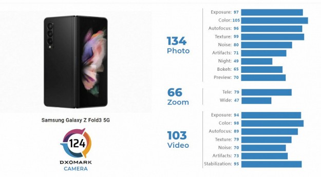 Samsung Galaxy Z Fold3 набрал 124 балла в обзоре DxOMarkЭто больше результата Samsung Galaxy S21 Ultra Специалисты DxOMark исследовали возможности камеры, которой оснащен смартфон Samsung Galaxy Z Fold3, и поставили ей оценку 124 балла. Камера на трех датчиках разрешением по 12 Мп оказалась лучше, чем у флагманской модели Samsung Galaxy S21 Ultra, которая «на бумаге» имеет более впечатляющие характеристики. В общем рейтинге камер мобильных устройств Samsung Galaxy Z Fold3 занимает 24 место.