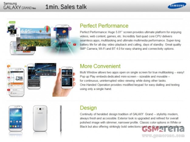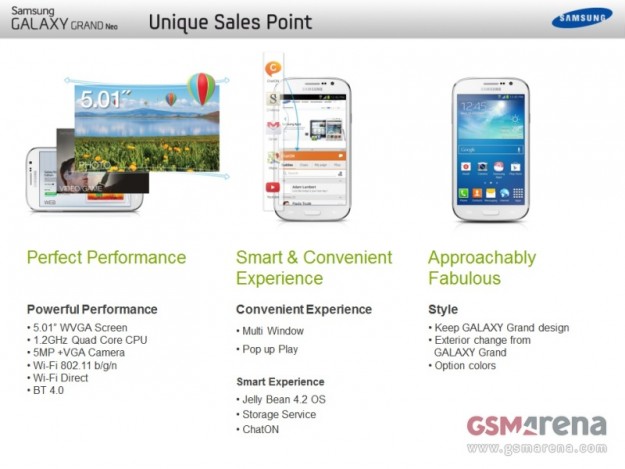 Samsung Galaxy Grand Neo будет работать на базе операционной системы Android 4.2 Jelly Bean с фирменной оболочкой TouchWiz. Его размеры составлят 143.7x77.1x9.6 мм.
