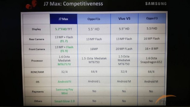 Исходя из опубликованного снимка, новинка южнокорейского производителя выйдет на рынок в качестве конкурента смартфонов vivo V5, Oppo F1s и F3. Galaxy J7 Max будет оснащен 5.7-дюймовым экраном с разрешением 1920х1080 пикселей, 8-ядерным процессором MediaTek MT6757V с частотой 1.6 ГГц, 4 ГБ оперативной памяти и 32 ГБ встроенной. За его фото- и видеовозможности будут отвечать две камеры по 13Мп, а в качестве программной платформы выступит Android Nougat.