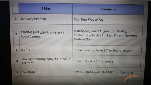 Samsung готовит к анонсу 5.7-дюймовый Galaxy J7 Max с двумя 13Мп камерамиСегодня в Сеть попал слайд с закрытой презентации компании Samsung, в рамках которой был представлен смартфон Galaxy J7 Max.