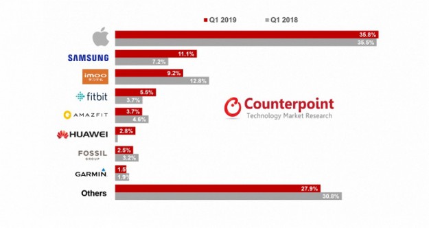 Аналитики Counterpoint оценили рынок умных часов по итогам первого квартала текущего года. Как это зачастую бывает в таких случаях, к умным часам аналитики относят всё то, что считают умными часами сами производители, тогда как на самом деле часть устройств лишена открытой ОС и фактически являются трекерами активности с расширенными возможностями.