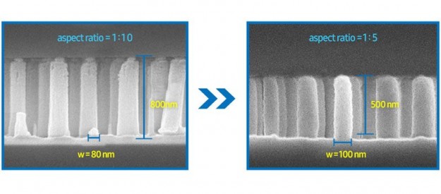 Ще один аспект розробки також пов'язаний з рівнем браку. Якщо висота елементів металінзи дорівнює одній довжині хвилі світла, то кожен наноелемент виходить із співвідношенням сторін 1:10. І без того тонкі волоски заломлюючих елементів виявляються надзвичайно крихкими при виробництві. Нова розробка дозволяє робити волоски коротшими, що змінює співвідношення сторін у кожному з них до 1:5. В результаті наноструктури стають міцнішими і менш схильними до браку в процесі масового випуску.