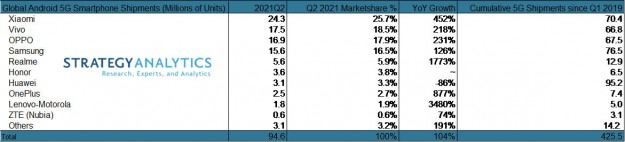 Samsung опустилась на четвёртое место, а Xiaomi возглавила мировой рынок 5G-смартфонов на AndroidВторое и третье место заняли Vivo и Oppo В новом отчете Strategy Analytics сообщается, что Xiaomi была ведущим мировым производителем 5G-смартфонов на базе Android во втором квартале этого года, захватив почти 26% рынка. Недавно Xiaomi обошла Samsung и возглавила мировой рынок смартфонов.
