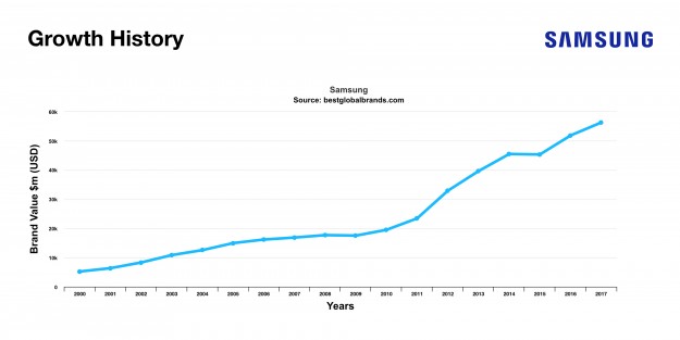 Samsung находится в ТОП-10 списка Interbrand с 2012 по 2017 годы, демонстрируя непрерывный рост стоимости бренда.