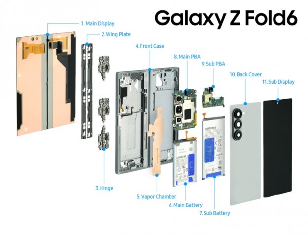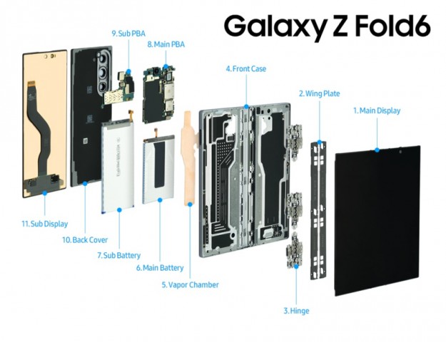Серед деталей Galaxy Z Fold6, які становлять інтерес, відзначається новий шарнір (3), використання якого зменшило товщину Z Fold6 у складеному вигляді на 1,3 мм. Завдяки застосуванню армованих матеріалів вдалося зменшити розміри петлі без шкоди для міцності. Так звана крильова пластина (2) не тільки захищає дисплей від ушкоджень, а й допомагає йому плавно складатися і розкладатися. У Galaxy Z Fold6 крім основної батареї (6) є і додаткова (7).