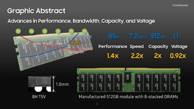 При производстве модуля DDR5-7200 объёмом 512 Гбайт Samsung использовала восьмислойный стэк кристаллов DDR5, объединённых с помощью технологии 3D TSV (through-silicon via), характеризующейся сквозными соединениями между слоями в произвольной точке.