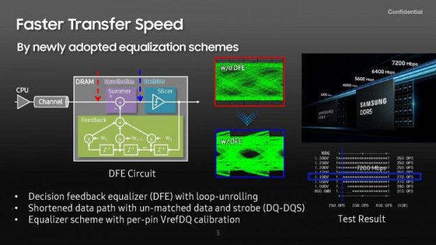 В ходе презентации Samsung также сообщила, что применила при производстве модуля памяти DDR5-7200 технологию Same Bank Refresh. Её особенность в том, что пока одни банки памяти могут выполнять обновление, другие банки могут быть заняты какими-либо другими операциями. Кроме того, производитель отметил увеличение на 10 % производительности шины памяти и сообщил о поддержке дополнительных схем Decision Feedback Equalization (DFE), улучшающих качество сигналов — они снижают отражённые шумы в каналах памяти на высоких частотах, что довольно важно при использовании большого числа DIMM и каналов DDR5.