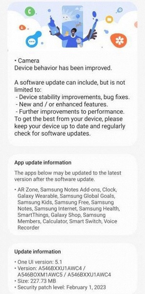 Samsung улучшила камеру недавно представленного смартфона Galaxy A54 5GПрошло лишь 10 дней с момента премьеры Samsung Galaxy A54 5G, и вот компания уже выпустила для него первое обновление прошивки. ПО обозначено номером A546BXXU1AWC4, размер составляет всего 228 МБ.