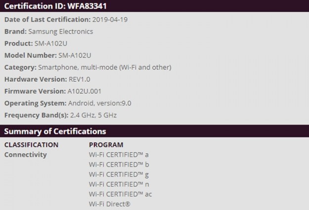 На сайте организации Wi-Fi Alliance появилась информация о новом смартфоне Samsung с обозначением SM-A102U: на коммерческий рынок этот аппарат, как ожидается, выйдет под именем Galaxy A10e.