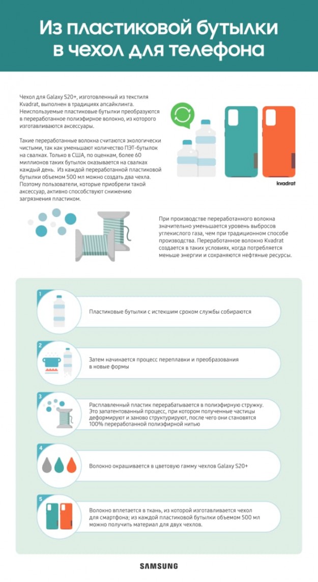 Samsung выпустила сделанные из мусора чехлы для Galaxy S20+Samsung, в рамках инициативы The Global Goals, направленной на защиту окружающей среды, представила серию аксессуаров для смартфонов и часов, созданных из пластиковых отходов. Чехлы для Galaxy S20+ и ремешки для Galaxy Watch Active 2 созданы при поддержке датского текстильного бренда Kvadrat, а основой для них стали повторно используемые пластиковые бутылки (с истекшим сроком годности) объемом 500 мл, которые переплавляются на текстильные волокна. По словам Samsung, одна такая бутылка позволяет обеспечить материал для двух чехлов для Galaxy S20+, а сам процесс производства является экологически чистым, «без участия тяжелой машинерии, тем самым способствуя сохранению возобновляемых источников энергии». Более подробно о всех этапах расскажет инфографика: