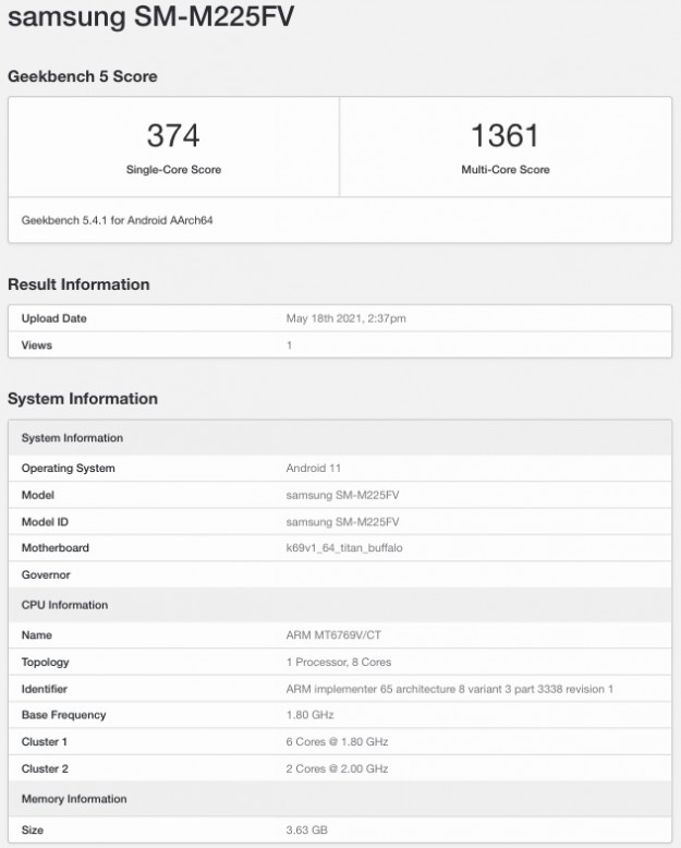 Samsung выпустит доступный смартфон Galaxy M22 на платформе MediaTekАссортимент смартфонов Samsung Galaxy, по сообщениям сетевых источников, в скором времени может пополнить недорогая модель с шифром SM-M225F. Информация о некоторых характеристиках этого аппарата появилась в базе популярного бенчмарка Geekbench.