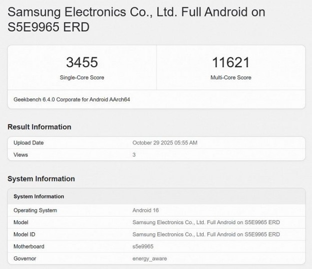 Флагманська однокристальна платформа Samsung нового покоління, Exynos 2600, знову з'явилася в базі даних Geekbench і показала вищі результати: 3455 балів в однопотоковому тесті і 11621 бал в багатопотоковому, що вище попереднього результату (3309 і 11256 балів відповідно).
