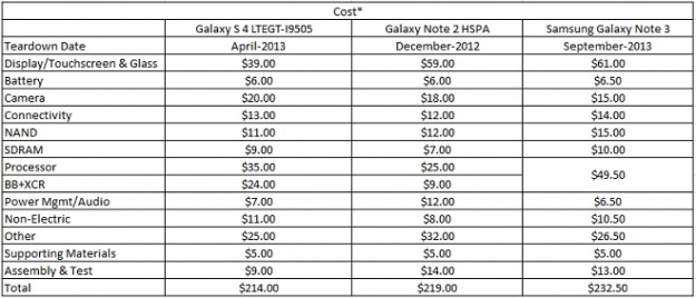 Веб-ресурс TechInSights решил выяснить, какая же себестоимость флагманского смартфона южнокорейского производителя. Итак, как выяснилось, компания Samsung на производство одного Galaxy Note 3 в версии с чипом Snapdragon 800 на борту тратит всего $232,50. Из них $61 приходится на дисплей, $49,50 на процессор, $6,50 на батарею, а еще $15 на модуль камеры. Стоимость других комплектующих также указана в прайсе, опубликованном TechInSights.