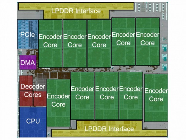 Нижняя иллюстрация дает представление о структуре Argos. Она включает контроллеры ввода-вывода и памяти, CPU для управления потоком данных, три ядра декодера и десять ядер кодера. Каждое ядро кодера способно в реальном времени кодировать видео с разрешением 2160p и кадровой частотой 60 к/с с использованием трех опорных кадров. Джерело: iXBT.com Обговорення новиниКоментариев пока никто не оставил. Станьте первым! Попередні новини
