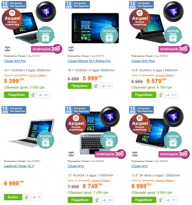 Скидки на планшеты и ультрабуки CHUWI в интернет магазине ЦитрусБренд CHUWI и сеть магазинов Цитрус предлагают акционные цены на 6 моделей планшетов и ноутбуков одного из самых продаваемых производителей. Цены начинаются с отметки 5999 грн за 10,1 дюймовый Chuwi Hi10 Pro. Подробности далее. Страница акции: https://goo.gl/7gmFEq Особенно стоит выделить интересные цены на две модели: Chuwi Hi10 Pro - 5999 грн