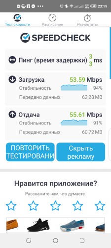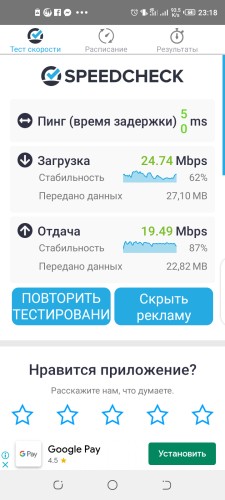Neffos A5/ Camon 12 Air Это не много. Для примера, замер на смартфоне Tecno Camon 12 Air с 4G показал скачивание на уровне 24,74 Мбит/с и выгрузку в 19,49 Мбит/с. Домашняя Wi-Fi сетьПодключаемся к сети Lanet на скорости 100 Мбит/с через роутер TP-Link Archer C2300 на котором создана 2,4 ГГц сеть (диапазон 5 ГГц Неффос А5 не поддерживает). Результаты:
