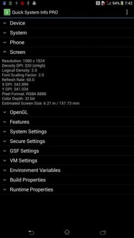 Разрешение дисплея, согласно полученной информации, составляет 1080x1824 точек, плотность пикселей на дюйм 342ppi, что подтверждает диагональ экрана в 6.4 дюйма.