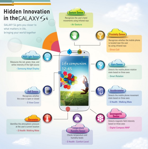 Скрытые инновации в смартфоне GALAXY S4Специальные датчики и технологии распознавания призваны упростить жизнь пользователей и сделать каждое мгновение более ярким и значимым. Новый флагман компании Samsung – смартфон GALAXY S4, который был представлен в Нью-Йорке, создан для того, чтобы объединить все самое ценное в единое целое и быть ближе к тем, кто по-настоящему важен для нас в жизни. В преддверие старта продаж GALAXY S4 вызвал к себе беспрецедентный интерес мирового сообщества. При первом знакомстве с GALAXY S4 пользователи могут быть очарованы его большим экраном и большой емкостью аккумулятора батареи, которые помещены в легкий и тонкий корпус. При дальнейшем знакомстве с возможностями смартфона становится ясно, что инновационные элементы нашли свое отражение не только в аппаратной составляющей устройства, но и в датчиках и технологиях распознавания. Смартфон GALAXY S4 оснащен девятью датчиками и широким спектром технологий распознавания, которые «понимают» поведение пользователя и подстраиваются под его потребности. Это выходит за рамки привычных функций, как, например, совершение звонков и работа с приложениями. Новый GALAXY S4 стирает любые границы в общении с друзьями и семьей, демонстрирует невероятную легкость в использовании, делая жизнь своего владельца проще, позволяет ему более качественно заботиться о своем здоровье.