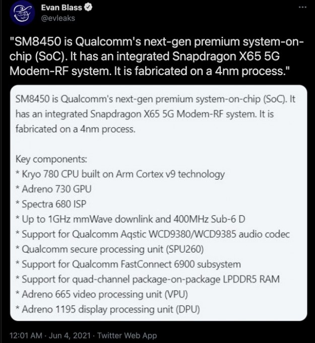 Известный источник утечек Эван Бласс (Evan Blass), не раз отличившийся точными сливами инсайдерской информации, опубликовал спецификации мобильной платформы, которая придёт на смену флагману Qualcomm текущего года Snapdragon 888, которая получит кодовое обозначение SM8450 (Snapdragon 888 — SM8350).