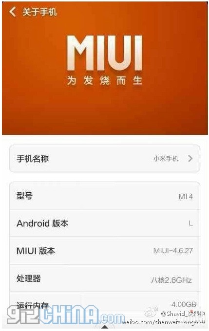 Слухи: Xiaomi Mi4 получит ОС Android L и с 4 ГБ ОЗУВ Сети опубликовали скриншот, сделанный якобы с флагманского смартфона Xiaomi Mi4, анонс которого состоится 22 июля.