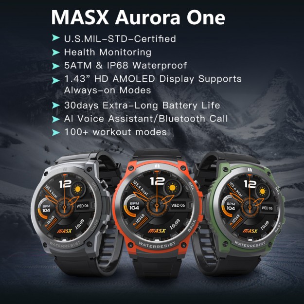 Смарт-часы MASX Aurora One отличаются привлекательным дизайном, доступной ценой и высокой функциональностью. Благодаря защищенности от воздействия влаги и пыли, а также падений и ударов в соответствии со стандартами IP68, IP69 и MIL-STD-810H, смарт-часы можно брать с собой на тренировку в любую погоду.