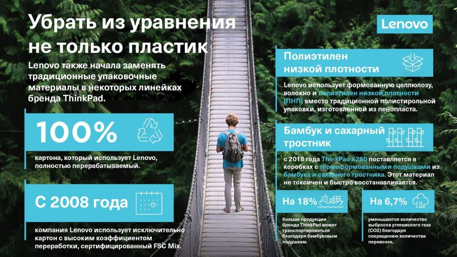 Смарт-упаковка из бамбука и без скотча: устойчивые инновации от LenovoКомпания Lenovo представила более экологичные упаковки для различных линеек бренда ThinkPad. Инженеры компании устранили скотч с нижней части упаковки, представив коробки, которые выполняют защитную функцию и закрываются без вспомогательных элементов. Новая конструкция упаковки имеет самоблокирующийся элемент с двумя шпунтами внизу и соответствующими отверстиями для фиксации, обеспечивающими большую стабильность. “До 2018 года продукция компании ежегодно нуждалась в 54 тоннах скотча для закрытия упаковок. В итоге использовалось 19,5 тысяч километров скотча, чего достаточно, чтобы покрыть половину экватора Земли. Теперь мы используем значительно меньше. Даже такие небольшие изменения могут иметь огромное влияние на улучшение состояния окружающей среды и устойчивое развитие бизнеса”, — комментирует Мэри Жак (Mary Jacques), директор по вопросам глобальной экологии и устойчивого развития Lenovo. Разделение скотча и картонной коробки является серьезной проблемой на перерабатывающих предприятиях. Благодаря упаковке, закрывающейся без посторонних элементов, используют меньше пластика, и больше картона попадает на переработку. Коробка с самоблокирующимся элементом — лишь одна из многих "зеленых" инициатив, которые Lenovo стала внедрять более десяти лет назад. Благодаря этим инициативам компании удалось сэкономить более 3100 тонн отходов от упаковки. Однако уменьшить зависимость от пластика в упаковке недостаточно. Другие материалы, которые когда-то считались важными для упаковки и доставки, также являются препятствием для устойчивых инноваций, например, полистирол. Мировой рынок полистирола в 2019 году по оценке ResearchandMarkets.com составил 42,7 миллиардов долларов, и прогнозируется, что к 2023 году он вырастет до 62,3 миллиардов долларов. Чтобы этого не допустить, Lenovo использует формованную целлюлозу, волокно и полиэтилен низкой плотности (ПНП) вместо традиционной полистирольной упаковки, изготовленной из пенопласта. Еще в 2008 году компания Lenovo начала использовать полностью перерабатываемый упаковочный материал и теперь требует от своих поставщиков соблюдения минимальных стандартов использования переработанных материалов. Компания начала заменять материалы и других частей упаковки в некоторых линейках продуктов бренда ThinkPad. Начиная с 2018 года ThinkPad X280 поставляется с термоформованными подушками из бамбука и сахарного тростника. Бамбук — одно из самых быстрорастущих растений в мире с годовым циклом жизни, не создает токсичных отходов в процессе производства, быстро восстанавливается и полностью компостируется. Бамбук делает упаковку более компактной, что позволяет транспортировать на 18 процентов больше устройств. Это уменьшает количество перевозок, и как следствие — количество выбросов углекислого газа (CO2) уменьшается на 6,7 процентов. Этот материал также применяется при упаковке устройств ThinkPad X390 и X13. Сейчас компания вводит использование бамбука в упаковках большего количества моделей, и скоро он будет представлен в коробке для ThinkPad X12 Tablet. Также в некоторых странах у потребителей есть возможность воспользоваться услугой возврата упаковки для повторного использования в других отправках. Новая конструкция коробок без скотча, упаковки из альтернативных материалов и и
