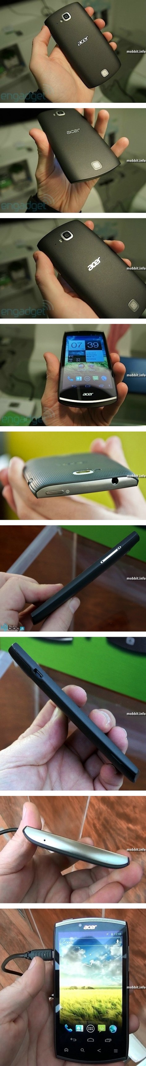 Выполняя свое обещание, компания Acer представила на MWC-2012 новый смартфон с выдающимся дизайном – CloudMobile. Модель, получившая за внешний вид престижную награду iF Design Award, обладает, кроме того, и весьма неплохими техническими характеристиками. Покупатель может рассчитывать на 4,3-дюймовый IPS-дисплей с разрешением 1280 x 720, двухъядерный процессор Snapdragon MSM8260A с тактовой частотой 1,5 ГГц, 1 ГБ RAM, 8 ГБ флеш-памяти, 8-мегапиксельную камеру, аудиосистему Dolby Mobile 3, MicroSD-картридер, Wi-Fi и Bluetooth, NFC, порты mini-HDMI и microUSB. Аппарат работает на базе ОС Android 4.0 Ice Cream Sandwich. Толщина новинки составляет 9,9 мм, вес – 125 г. Галерея живых фото и видео далее.