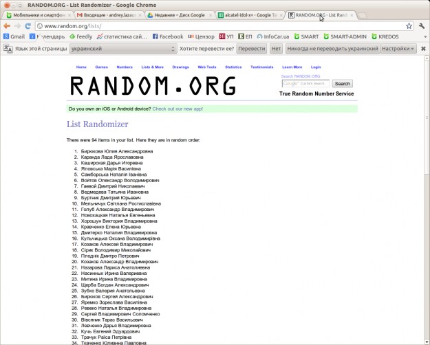 Подпись к картинке - Мы с Гарри Маквеем постоянно путаем себя друг с другом! Три дополнительных приза в виде пополнения счета мобильного оператора на 50 грн получают участники, выбранные сервисом http://www.random.org/lists/ с 2 по 4 место: 2. Каранда Лада Ярославовна 3. Каширская Дарья Игоревна 4. Яловська Марія Василівна Всего в конкурсе приняли участие 94 человека. Поздравляем и благодарим Всех за участие! Если Вы упустили свой шанс - не отчаивайтесь, ведь сейчас у нас проходит еще один конкурс . А кроме того, в группе ВКОНТАКТЕ ALCATEL ONETOUCH будет разыгран дополнительный приз по результатам пользовательского голосования за работы участников. С победителем, выигравшим ALCATEL ONETOUCH IDOL X+, редакция Smartphone.ua свяжется в ближайшие два дня. Мобильные счета участников будут пополнены в течение двух суток. Видео выбора победителей — https://www.youtube.com/watch?v=DLnTx4T7Xkc Джерело: SmartPhone.ua Обговорення новиниКоментариев пока никто не оставил. Станьте первым! Попередні новини
