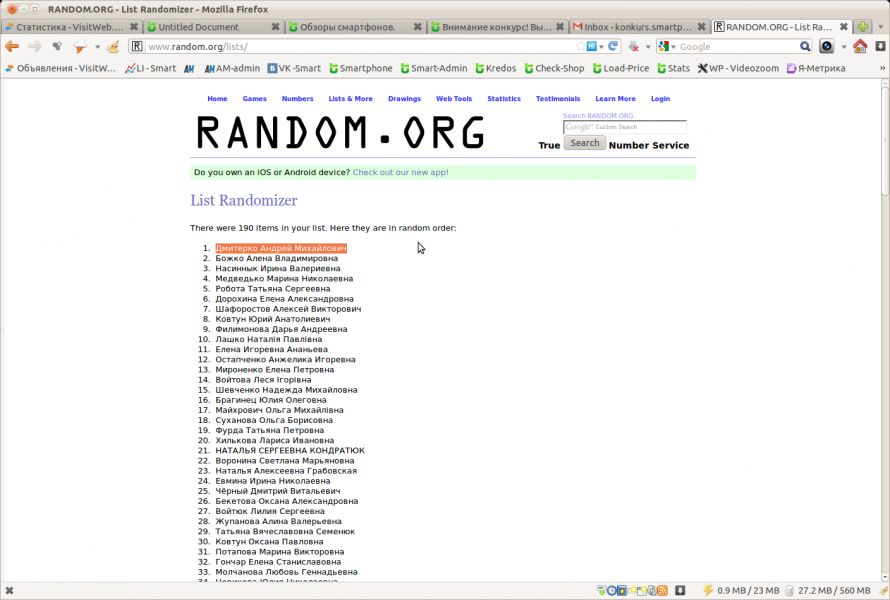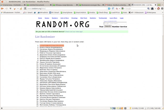 Пять дополнительных призов в виде пополнения счета мобильного оператора на 50 грн получают участники, выбранные сервисом http://www.random.org/lists/ с 2 по 6 место: 2. Божко Алена Владимировна 3. Насиннык Ирина Валериевна 4. Медведько Марина Николаевна 5. Робота Татьяна Сергеевна 6. Дорохина Елена Александровна За активность и интерес к конкурсу 10 призов по 10 грн на счет мобильного телефона получают участники, занявшие в списке 7-11 место и 186-190 место: 7. Шафоростов Алексей Викторович 8. Ковтун Юрий Анатолиевич 9. Филимонова Дарья Андреевна 10. Лашко Наталія Павлівна 11. Елена Игоревна Ананьева 186. Уманец Марина Ивановна 187. Генсьор Наталія Йосипівна 188. Захарова Татьяна Александровна 189. Онищенко Оксана Николаевна 190. Насиннык Ирина Валериевна Поздравляем и благодарим Всех за участие! С победителем, выигравшим ALCATEL ONETOUCH POP C3, редакция Smartphone.ua свяжется в ближайшие два дня. Мобильные счета участников будут пополнены в течение двух суток. Видео выбора победителей — https://www.youtube.com/watch?v=pW5bvUz5IUM Джерело: SmartPhone.ua Обговорення новиниирина: Супер! повезло! поздравляю победителей!!! Вадим: Поздравляю