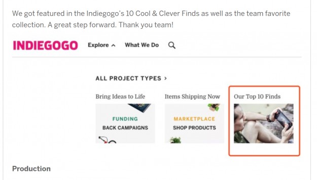 Кампания также выставлена в 10 лучших продуктах на Indiegogo и занимает первое место в 10 крутых и интересных гаджетах. Удивительная популярность кампании также подтверждается тем фактом, что она достигла 473% от собираемой суммы в 20 000 долларов США, при этом 94,633 доллара США собрал 331 человек.