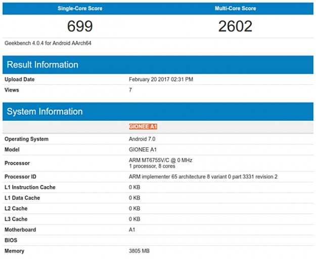 Смартфон Gionee A1 протестирован в GeekbenchНе представленный еще официально смартфон Gionee A1 прошел тестирование производительности в бенчмарке Geekbench, где в одноядерном режиме набрал 699 баллов, а в многоядерном 2602.