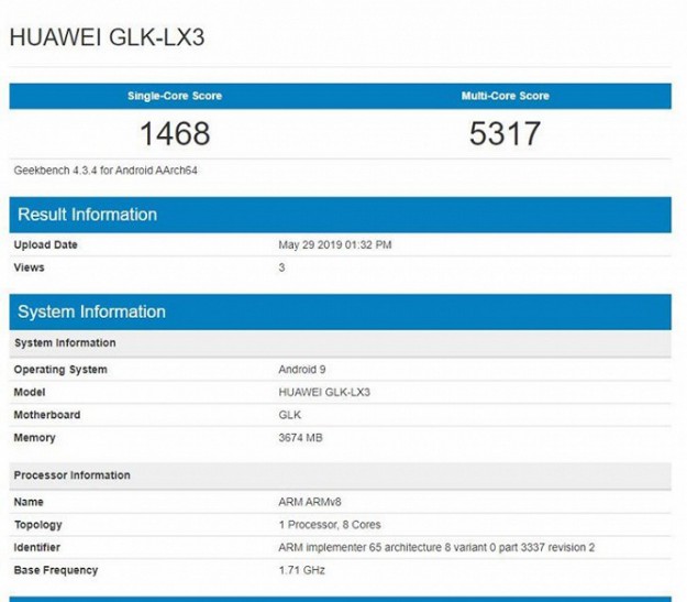 Смартфон Huawei Nova 5i засветился в Geekbench, SoC Kirin 710 подтвержденаВ бенчмарке Geekbench замечен перспективный смартфон Huawei под обозначением GLK-LX3. Как пишет источник, под этим каталожным номером скрывается модель с торговым названием Nova 5i.