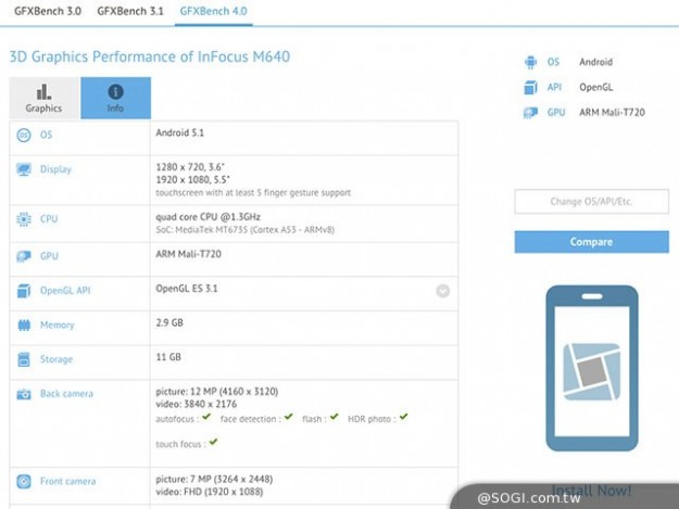 Смартфон InFocus M640 получит два экрана и 3 ГБ ОЗУКомпания InFocus готовит к анонсу смартфон M640 с двумя дисплеями. По крайне мере, на это намекает бенчмарк GFXbench, где уже успела засветиться будущая новинка китайского производителя. По данным тестера, InFocus M640 будет оснащен 5.5-дюймовым Full HD дисплеем и 3.6-дюймовым HD, 4-ядерным процессором Mediatek MT6735 с частотой 1,3 ГГц и графикой Mali 450, 3 ГБ оперативной памяти и 16 ГБ встроенной.