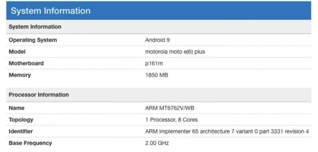 Речь идёт об аппарате Moto E6 Plus. Данные теста говорят об использовании процессора MediaTek Helio P22, который объединяет восемь вычислительных ядер ARM Cortex-A53 с тактовой частотой до 2,0 ГГц, графический ускоритель IMG PowerVR GE8320 и сотовый модем LTE.