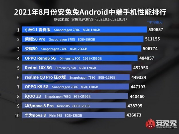 Тройку лидеров замыкает ZTE Nubia RedMagic 6 Pro на базе Snapdragon 888, который набирает 829 331 балл. В топ-10, помимо iQOO 8 Pro, вошёл лишь ещё один смартфон на базе Snapdragon 888+ — Xiaomi MIX 4, который набрал 806 058 очков. Что касается смартфонов среднего класса, лидером в рейтинге производительности является Xiaomi 11 Youth Edition, основанный на 5-нм Snapdragon 780G. Он демонстрирует производительность на 530 657 баллов. Второе и третье места занимают Honor 50 Pro и Honor 50, которые набирают 511 155 и 506 774 очков соответственно. Эти устройства основаны на чипсете Snapdragon 778G. В рейтинге «середнячков» представлены также смартфоны на базе чипов MediaTek Dimensity и HiSilicon Kirin 985. Именно на последнем основан Huawei Nova 8, который замыкает десятку лидеров.
