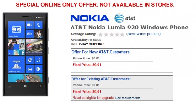 Смартфон Nokia Lumia 920 можно купить всего за центПока большое количество европейских рынков испытывают дефицит во флагманском смартфоне компании Nokia, модели Lumia 920, в США стоимость аппарата снизилась до абсолютного минимума, который вообще возможен теоретически. Известный местный продавец Car/Toys предлагает смартфон за символический один цент. Конечно же, покупатели этого аппарата, получают «в нагрузку» контракт с оператором. Каким периодом, не говорится, но врядли это меньше, чем на два года. Говорят, что абонента «подключают» к сети местного AT&T на минимальный тариф в месяц $70. Правда, здесь еще достаточно много бонусов – порядка 3ГБ трафика в 4G плюс 450 минут разговоров по всем штатам.