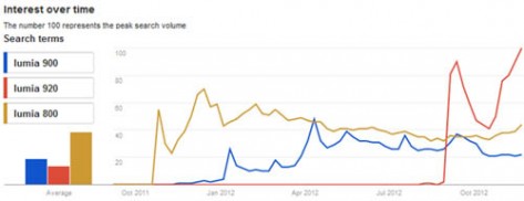 Смартфон Nokia Lumia 920 популярнее Lumia 800 и 900Согласно данным Google Trends, пользователи чаше интересуются смартфоном Lumia 920, чем моделями предыдущих поколений – Lumia 800 и Lumia 900. Однако хотя успех Lumia 920 на фоне предшественников имеет место быть, все же в отличие конкурентов – iPhone, либо смартфонов Galaxy, он весьма условный. Впрочем, надо отдать должное – все же мало кто сомневался, что 920 Lumia будет продаваться лучше, чем модели предыдущих поколений.
