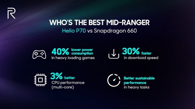 Руководитель Realme Мадхав Шет (Madhav Sheth) уже подтвердил использование в новом смартфоне процессора Helio P70, сравнив его с чипом Snapdragon 660. Утверждается, что решение Helio P70 выигрывает у Snapdragon 660 в плане быстродействия и потребления энергии.