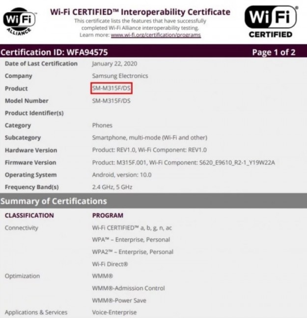 По сообщениям сетевых источников, южнокорейская компания Samsung готовится выпустить смартфоны Galaxy M11 и Galaxy M31. Стало известно о том, что аппарат Galaxy M31 прошёл сертификацию Wi-Fi Alliance и Bluetooth SIG. Предполагается, что он может быть официально запущен уже в следующем месяце.