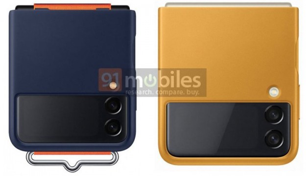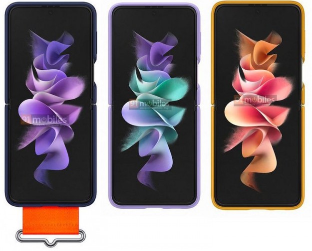 Сообщается, что для Galaxy Z Flip 3 будут доступны чехлы из кожи и силикона с небольшим ремешком или кольцом для ношения. Показаны три цветовых варианта — тёмно-синий, песочно-жёлтый и пурпурный. Рендеры аксессуаров подтверждают информацию о дизайне аппарата. В тыльной части корпуса расположатся вспомогательный дисплей (с диагональю 1,9 дюйма) и двойная камера со вспышкой.