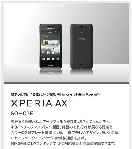 Смартфон Sony Xperia AX представлен в ЯпонииЯпонская корпорация Sony совместно с оператором NTT DOCOMO представили на родном для компании японском рынке новый Android-смартфон Xperia AX. Сообщается, что новинка поступит в продажу еще до конца нынешнего года. Заявлено, что одной из особенностей нового смартфона является защищенность аппарата от попадания во внутрь корпуса пыли и воды. Помимо этого, новинка получила несколько функций, присущих сегодня устройствам, продаваемым на рынке Японии: ИК-порт, цифровой мобильный тюнер, а также мобильный кошелек.