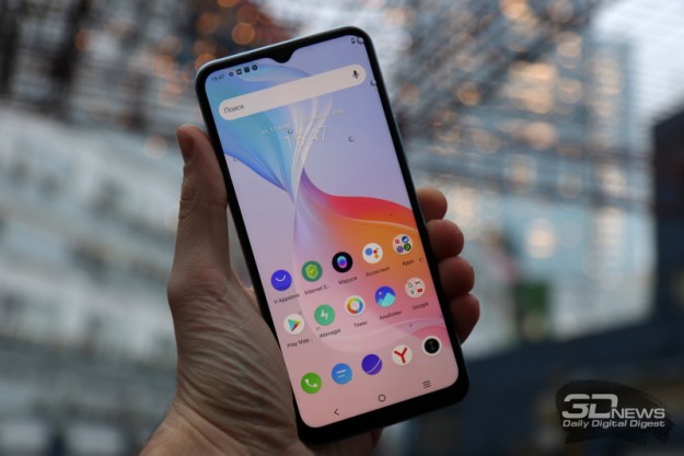 Передняя панель vivo Y21 исполнена, на первый взгляд, весьма обыденно: относительно крупные рамки вокруг экрана (он занимает 81,9% лицевой поверхности), фронтальная камера в вырезе-«капельке». Но стоит приглядеться, как замечаешь необычное — экран словно слегка выступает над корпусом, ребра исполнены «ступенчато»; своеобразный аналог изогнутых панелей, которые применяются на флагманских смартфонах.