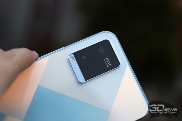 Также исполнена и спинка, что помогает более комфортно держать относительно толстый (8 мм) смартфон. Но вот покрытие спинки уже точно впечатляет — в версии «бриллиантовое сияние» она словно имеет мозаичную структуру и очень красиво переливается на свету… может, и не как настоящие бриллианты, но примерно в том же духе. На этой панели расположен аккуратный черный блок с двумя камерами и вспышкой, который перекликается с фирменным стилем, распространяющимся на все более дорогие аппараты vivo (вплоть до Y31). Смотрится отлично. Также существует вариант vivo Y21 в цвете «синий металлик», и он воспринимается уже куда более обыденно. В комплекте имеется чехол из прозрачного силикона.