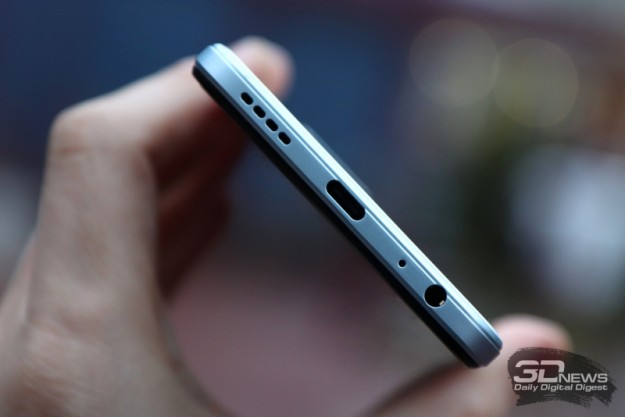 Лицевая панель прикрыта закаленным стеклом, ребра и задняя панель исполнены из пластика. Функциональные элементы более-менее стандартны, хотя отмечаем боковой сканер отпечатков пальцев вместо расположенного на задней панели — это чуть менее удобно, но, опять же, зато более модно. Мини-джек на месте — здесь это место расположено на нижней грани, рядом с портом USB Type-C.