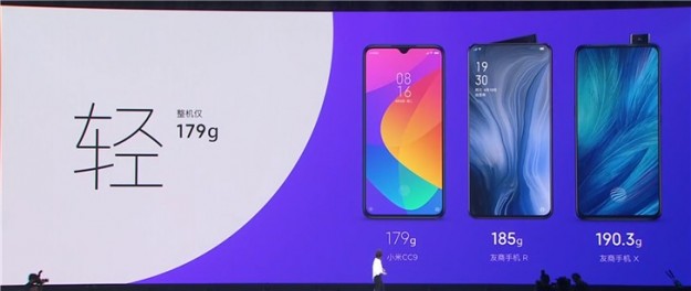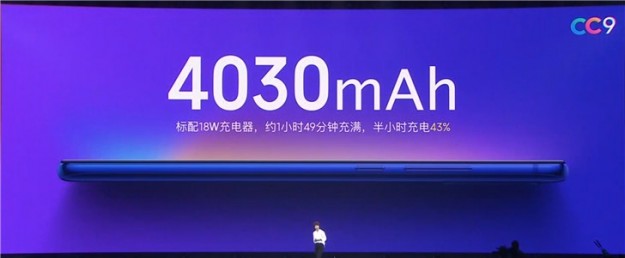В CC9 установлен аккумулятор емкостью 4030 мА·ч. Учитывая разницу в энергопотреблении и емкости аккумуляторов Mi 9 и CC9, можно предположить, что по автономности новинка существенно обойдет флагман. Впрочем, производительность при этом принесена в жертву. CC9 поддерживает быструю зарядку мощностью 18 Вт, по официальным данным аккумулятор устройства заряжается на 43% всего за полчаса. Масса новинки составляет 179 граммов — это одна из самых легких моделей в классе, особенно с учетом емкости аккумуляторной батареи.