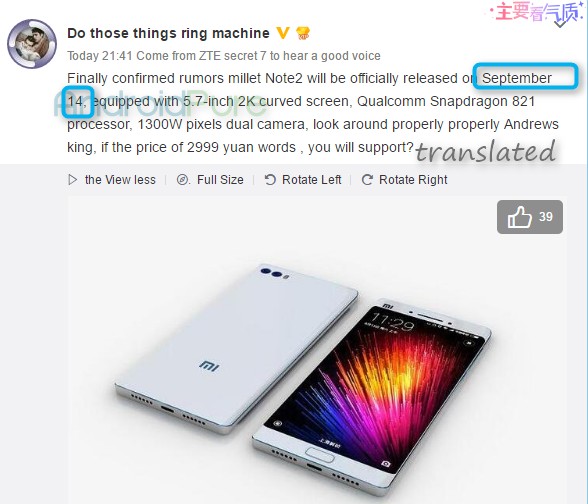 Согласно данным пользователя социально сети Weibo, Xiaomi Mi Note 2 представят 14 сентября — в среду на следующей неделе. Это сообщение кажется ресурсу gizmochina.com вполне правдоподобным, так как другие источники говорят, что анонс новинки состоится в ближайшие дни. Следует отметить, что на вышедшем тизере указана другая дата — 24 сентября. Но, как утверждает ресурс gizmochina.com, китайские компании, включая Xiaomi, обычно не проводят презентации флагманских устройств в субботу, поэтому анонс Xiaomi Mi Note 2 в этот день вызывает сомнения.