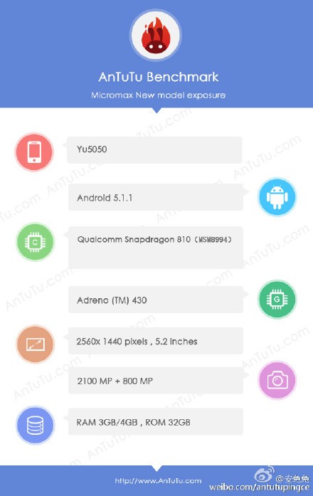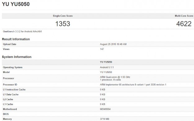 Смартфон YU YU5050 получит Snapdragon 810 SoC и 4 ГБ ОЗУВ базе данных индийского логистического веб-сайта Zauba, а также в популярных бенчмарках Geekbench и AnTuTu "засветился" не представленный еще официально флагманский смартфон от созданного индийской компанией Micromax бренда "Yu" - модель YU YU5050.